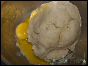 - When the dough has cooled, add the egg yolks and mix it into the dough. The dough needs to be cool or lumps will form, and the ingredients won't bind.2 Egg Yolks