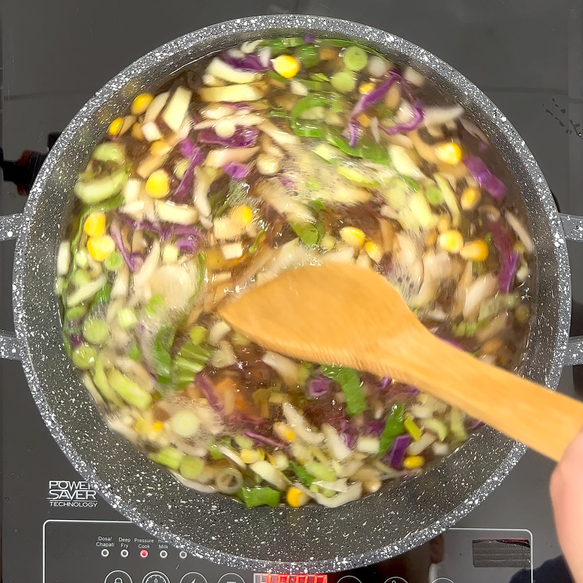 I usually like to throw in a red cabbage, baby bok choy, green onion and corn combination because these vegetables cook through fast, and they elevate the aesthetics of this soup.