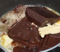 - In a double boiler, melt the chocolate and butter together on slow heat. make sure that the chocolate doesn't burn and turn off the stove once melted.