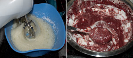 - Beat the egg whites and when they are half way stiff, add the remaining powdered sugar and continue to beat to a stiff snow. First fold half of the stiff snow into the beet flour chocolate batter from earlier and then add the remaining half as well. Fold in carefully and don't mix in a turning motion, the folding helps to retain the fluffiness of the egg whites. Make sure that it is well combined into a smooth batter.