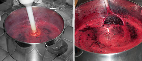- Take it briefly from the heat, and blend the jam with a hand blender. You can leave it chunky or smooth.