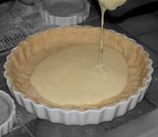 - Once the dough is finished baked, take it out and remove the baking paper with the beans/lentils. Pour the vanilla sauce into the tart and spread evenly.
