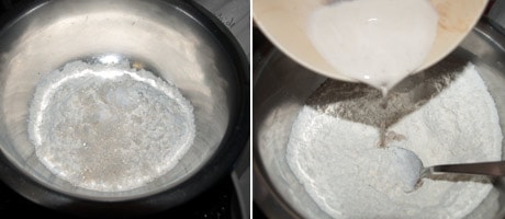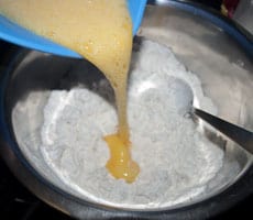 - In a mixing bowl combine the dry ingredients first, 250 grams flour, sugar, and salt. If you use dry active yeast instead of instant yeast, mix the yeast into the lukewarm milk (The milk must not be hot or the yeast will die!) and wait until you can see some bubbles form (that's to test if your yeast is alive and healthy). For fresh yeast just crumble the yeast cube into the other ingredients. Add the milk and yeast to the dry ingredients.