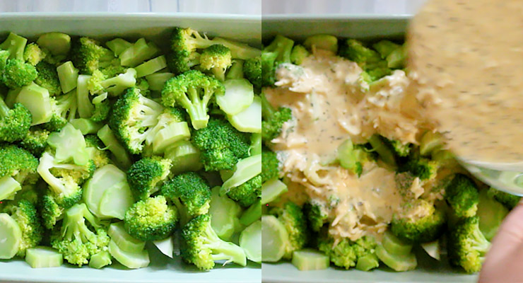 The recipe is simple. The broccoli is pre-boiled to retain nutrients the green color, and it also softens it for the baking process. You can use frozen broccoli too.