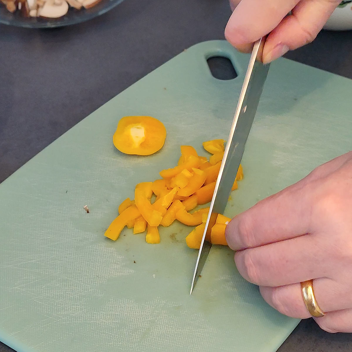 - Prepare all the fresh produce first, and keep each separate aside. Slice the onion, chop the garlic, slice the bell pepper, and the mushroom.1 Medium Onion, 2 Cloves Garlic, 8 Ounces Mushroom, 2-3 Small Bell Pepper