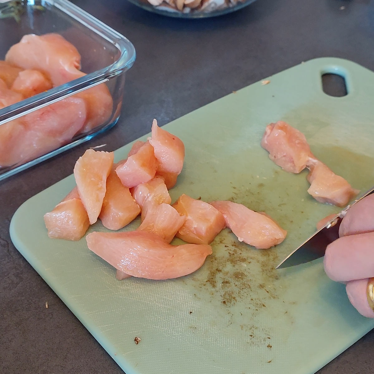 - Cut the fresh chicken into smaller strips.1 Large Chicken Breasts