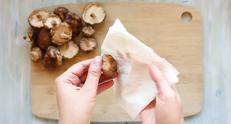 - Clean your mushrooms from dirt. Don't rinse mushrooms with gills because water gets trapped in the gills. Scrub them with a brush. Porcini and button mushrooms can be rinsed but dry them well with a kitchen cloth or paper.10 ounces Mushrooms