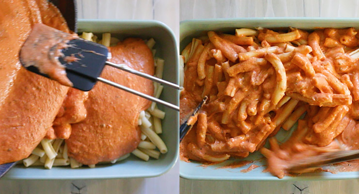 - Pour cheese sauce over the pasta and mix it all in so that the pasta is well coated.