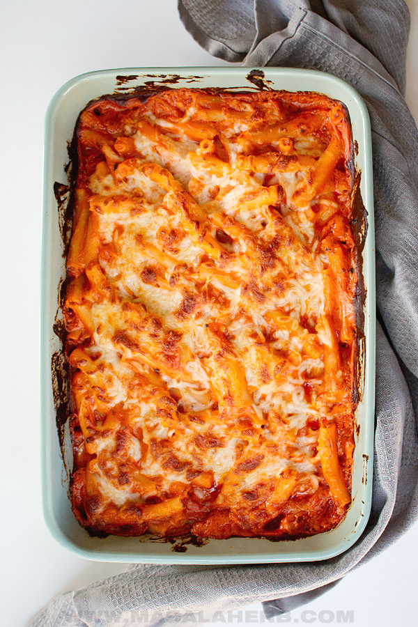 A comfort food classic: five-cheese ziti al forno baked crispy in a casserole baking dish. This is a family favorite, and it's vegetarian.
