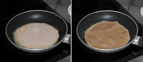 - Then heat up your pan, add ½ Tablespoon Butter to it. Add nearly 1 ladle of liquid dough to the hot oily pan, spread well by turning the pan quickly and fry both sides until they are a bit golden.