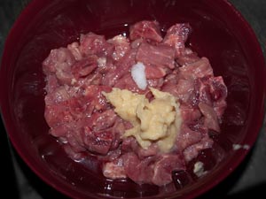 - Cut your Beef undercut into 1 cm sized dice. Keep in a bowl with Ginger Garlic Paste, Salt and Coconut Vinegar or White Vinegar or Lemon Juice. Mix it well and allow to marinate for minimum 20 minutes. The longer you keep it marinated the more flavor it will have at the end.
