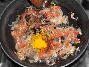 - On another hot plate prepare a frying pan with the oil and fry your onions first translucent. Afterward add the garlic, chili and tomato pieces and stir fry for 1-2 minutes before you throw in the Chilli, Turmeric powder and the Pepper.