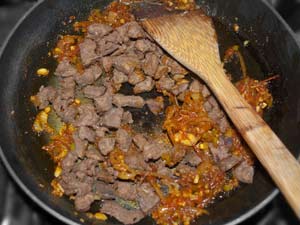 The flavorful, but not super hot and spicy, Beef Stir Fry includes tomato, onion, fresh green chili, and garlic.