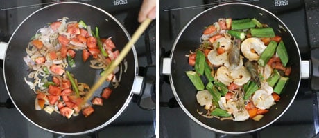 - Then add the tomato dices and fry for 1 minute and after that add in the Okra pieces and stir fry for another minute.