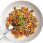 We love this one-pan skillet/wok meal, which is packed with fresh vegetables, ground meat and a selection of warm flavorful spices and herbs.