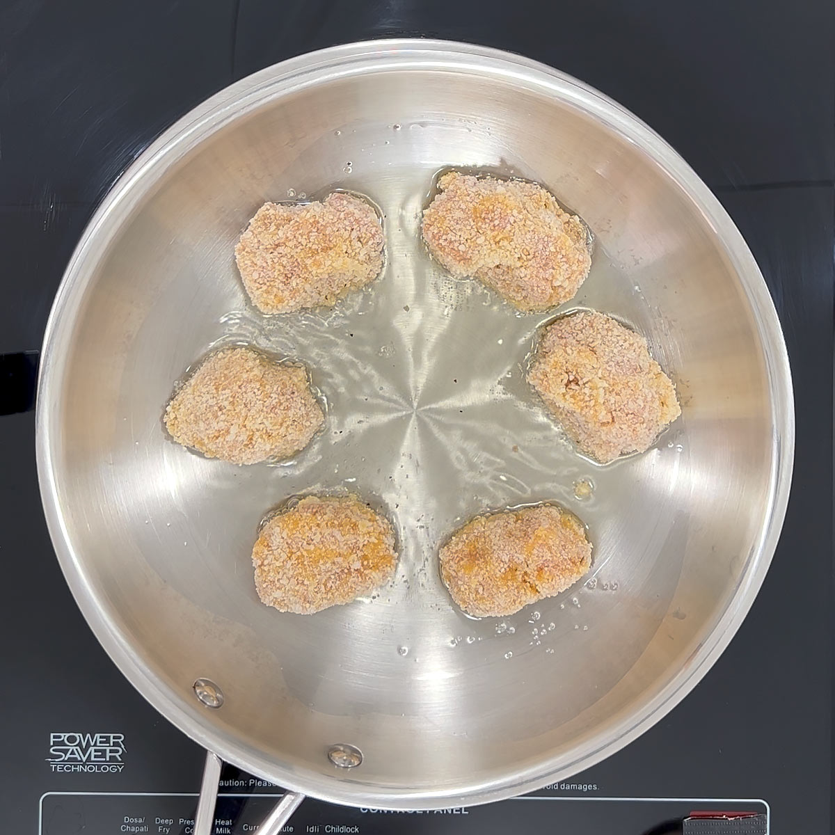 - Heat a skillet with a tablespoon of oil at a time (each batch requires 1 tablespoon of oil to fry). Wait for it to heat up and keep on a medium-high setting. Test if it's hot enough by dropping a tiny quantity of bread crumb mix into the hot oil to see if the oil catches on and the mix is frying.2-3 Tablespoon Oil