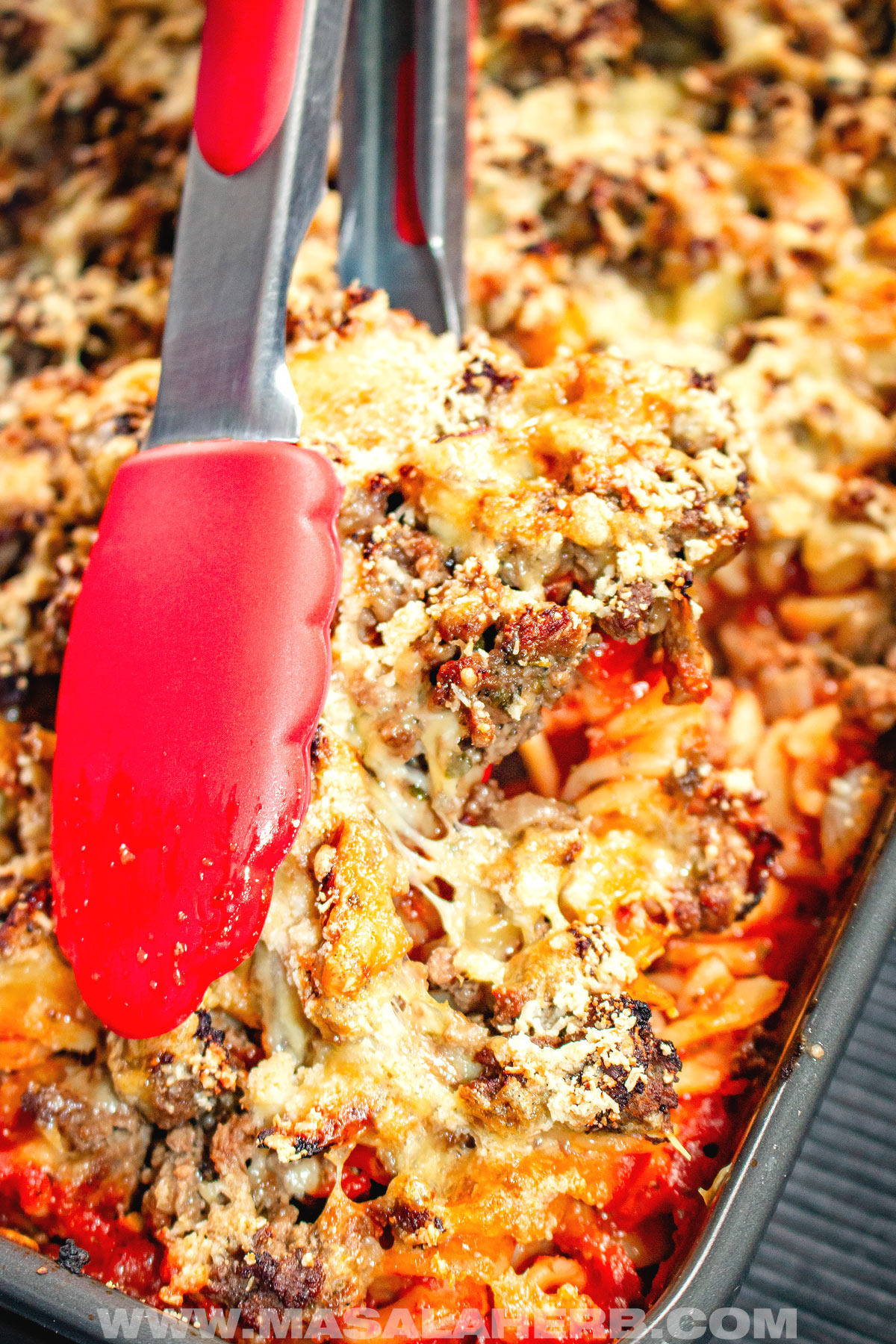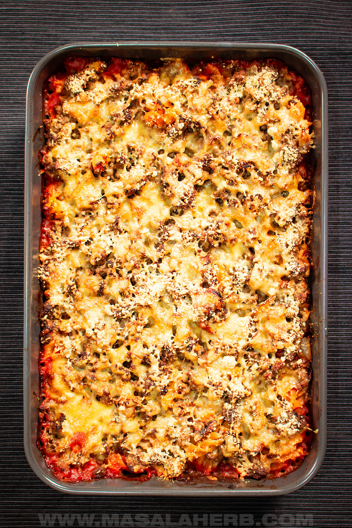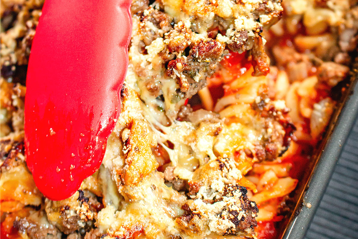 Johnny Marzetti is a baked comfort noodle dish prepared with tomato sauce, ground beef, and topped with cheese.