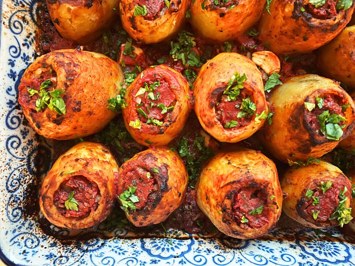 Potatoes hollowed and filled with seasoned meat turn into a dish that's both hearty and full of flavor. As they bake, the potatoes soften and absorb the spices, making each bite rich and comforting. Serve them straight from the oven for a meal that brings everyone to the table.