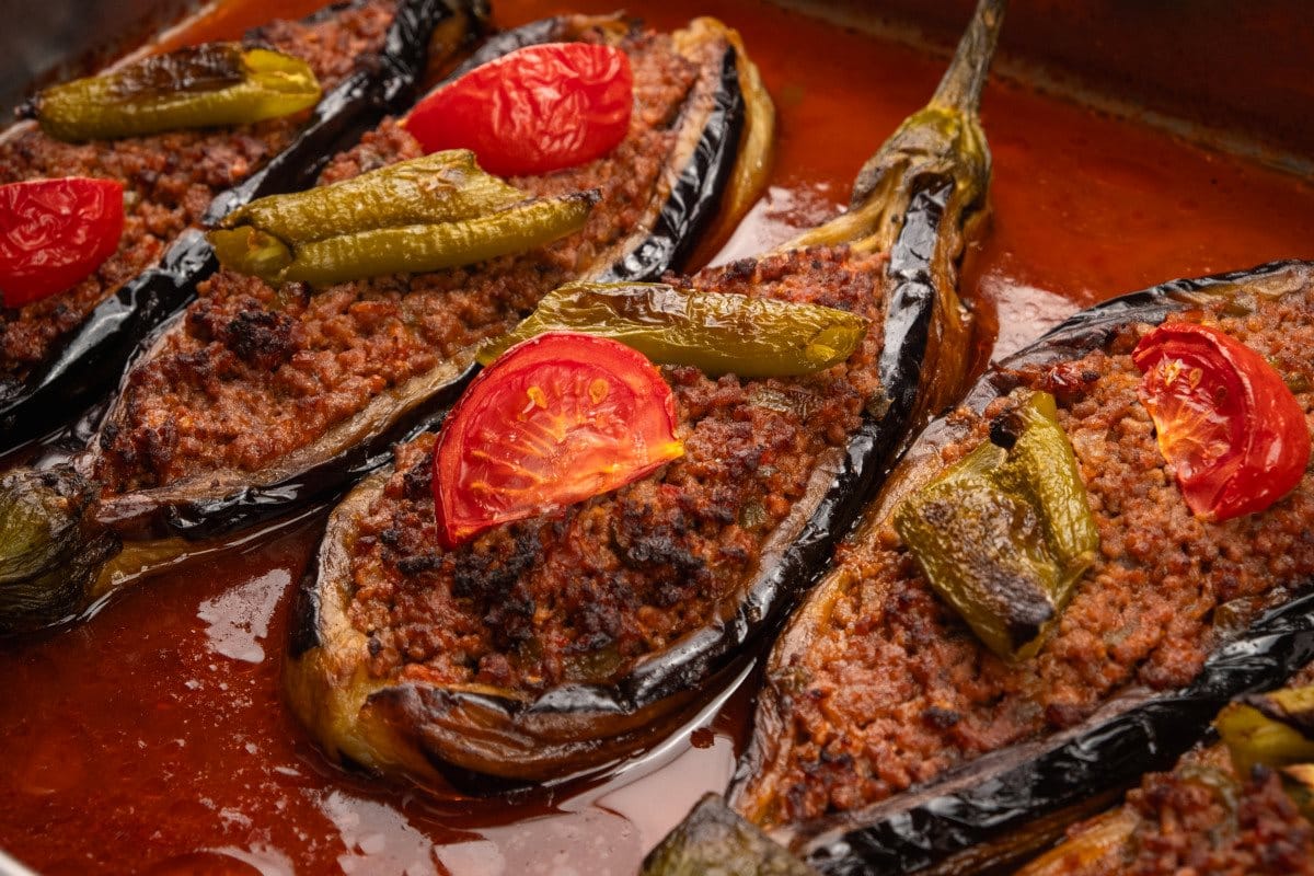 Plump eggplants filled with spiced meat and herbs bring deep, rich flavors to the table. The vegetables turn silky as they bake, soaking up every bit of seasoning. A vibrant dish that highlights the best of Turkish home cooking.
