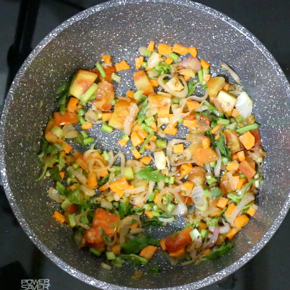 Sauté onion and tomato. Stir in ginger, garlic, celery greens, and carrots.