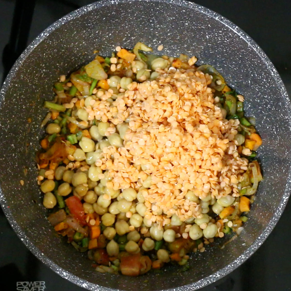- Throw in the red lentils and the cooked chickpeas. Mix and let cook for a minute.1 Cup Red Lentils, 1 Cup Chickpeas