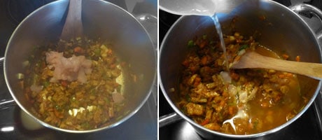 - Add the apple to the soup with the bay leave, lentils and rice.