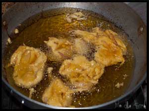 - Now heat up the Oil which you kept aside for deep frying. In the mean time cut your Onions and add them to the batter and mix them in well. To test if the oil is hot enough, drop in a bit of batter, if its ready it will pick up and fry. With a spoon add in small batches of the onion batter mix. don't let the skillet get over crowded or they ll stick all together. Turn the pakoras in between and fry them till they reach a golden coloring. Repeat the process with the rest of the batter.