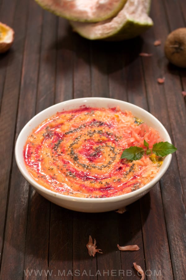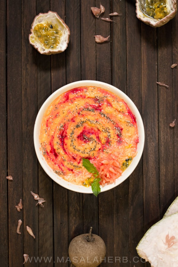 Today I am sharing my recent breakfast obsession a tropical pomelo smoothie bowl which I tend to prepare with fresh fruits from the garden.