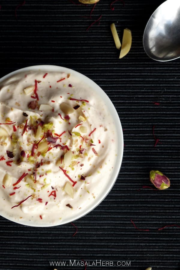 The Shrikhand Recipe is made with greek yogurt, saffron threads, green cardamom, and nuts.