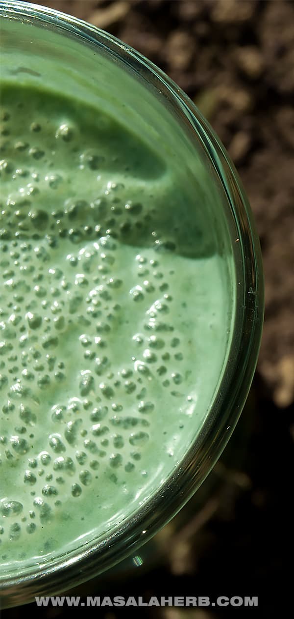 Green Spirulina smoothie is prepared with a powder of dried spirulina algae.
