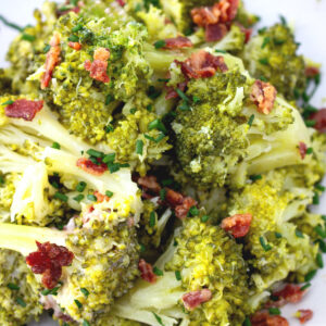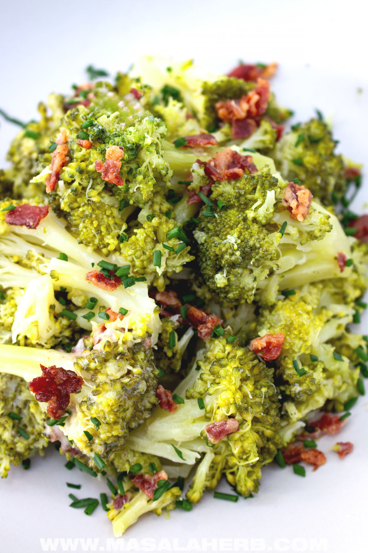 A warm flavor-packed simple broccoli salad with crispy fried bacon, topped with a vinaigrette.