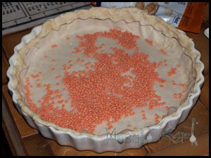 Add the previously cut out baking paper on top with some weight such as a handful of beans or lentils. That will prevent the dough to blow up in the center and to stay even. Bake the dough by itself for 10 mins at 390° Fahrenheit/ 200° Celsius.