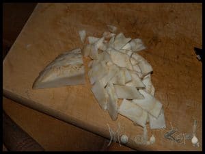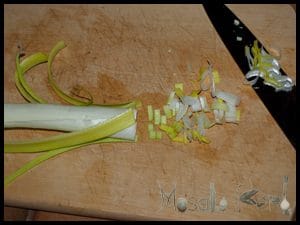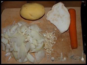 Slice the Onion and chop the Garlic. Peel the Potato, Carrot, Leek and Celery