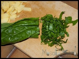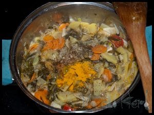 Throw in the other Veggies, Carrot, Potato, Celery, and Leek, mix and fry for a minute. Now add the cut sorrel leaves and stir-fry for 2-3 min on medium to slow heat. The Sorrel will lose some of its green colors and turn brown, that's perfectly normal!