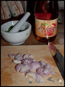 Roughly cut the 2 shallots and add the bits as well to the herbs in the glass jar.