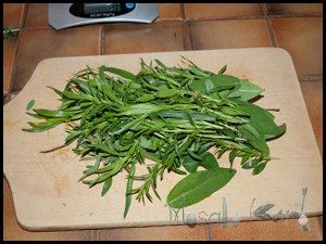 Collect the fresh herbs. Weigh them to the required amount. In a mortar smash one batch at a time. That will help to release the herbs aroma oil. Keep in a clean glass jar
