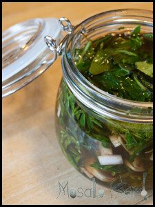 Pour Apple Vinegar over the herbs and shallots till it is all covered, to the top.